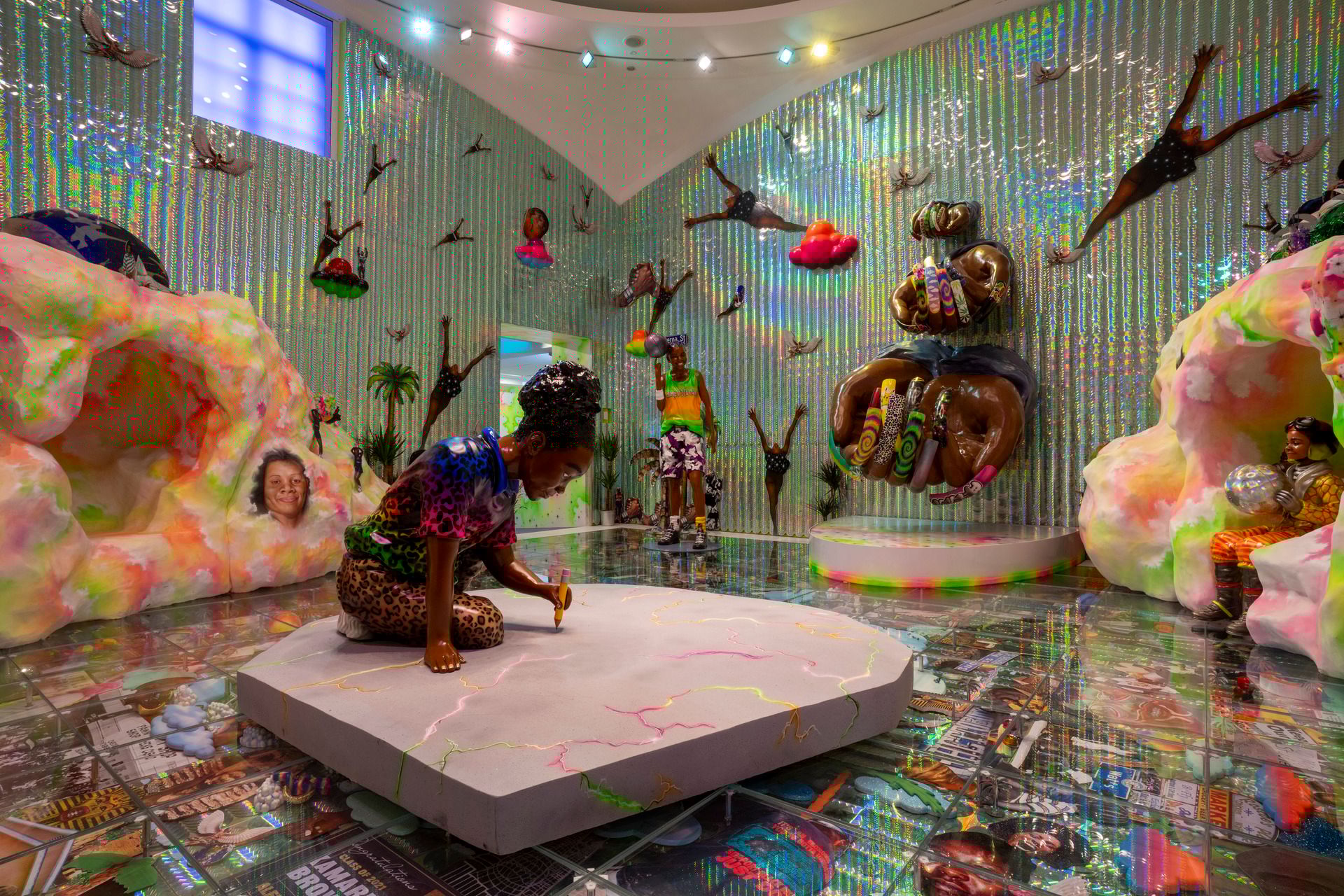 Lauren Halsey’s work is rooted in South Central Los Angeles. Across installation, sculpture, and two-dimensional works, she draws from local architecture, visual culture, and social histories. Her practice reshapes how a place is seen and valued, celebrating Black life and cultural abundance.