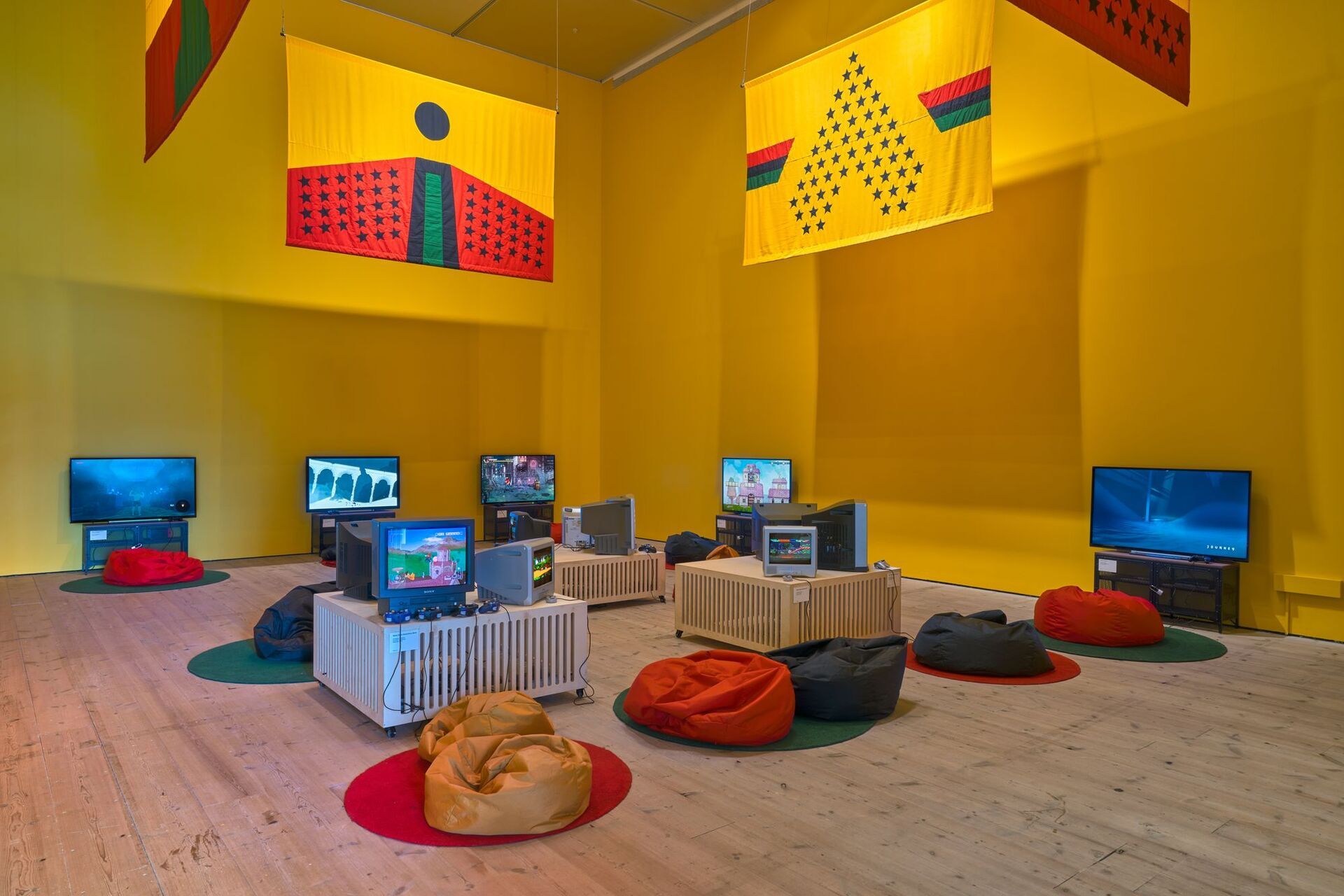 Installation view of Gaming Room for Wayfinder by Larry Achiampong at BALTIC (2023). Credit: Reece Straw
